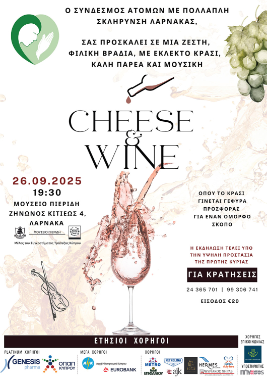 Ο Σύνδεσμος στα πλαίσια των προσπαθειών του για στήριξη των προγραμμάτων που λειτουργεί προς τους ασθενείς με Πολλαπλή Σκλήρυνση Λάρνακας, διοργανώνει και για φέτος την υπέροχη φιλανθρωπική βραδιά Cheese & Wine, απολαμβάνοντας κρασί και μουσική από βιολί.
